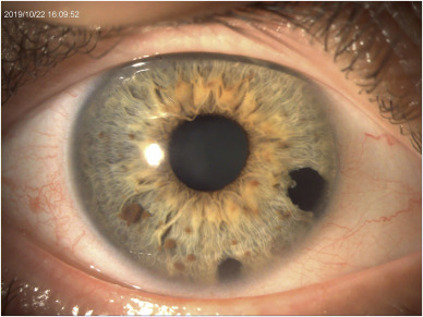It consists of splitting of the iris that is not contingent with the sphincter muscles at the root of theiris. In the pseudopolycoria, the holes in your irislook like additional pupils. These holesare usually just a defect of the iris and do not cause any issues with your vision. Pseudopolycoria is distinguished from true polycoria by the passive constriction of the accessory pupil when the true pupil is dilated and is characteristic of essential iris atrophy that can be associated with sickle syndrome, polymorphous dystrophy [12], and juvenile glaucoma. It occurs when greater than one pupil appears to be present but active dilatation of true pupil leads to passive constriction of the adjacent falseor accessory pupil.
