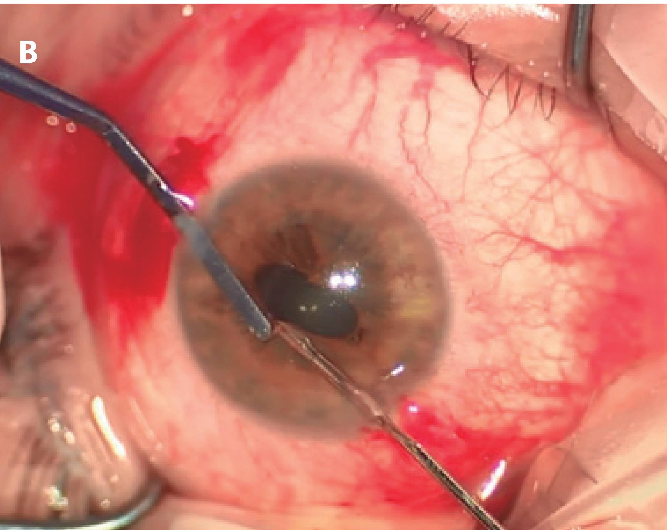 Fig. 6: A) Intraoperative image showing, iris (upper part), B) Intraoperative image showing cutting of the cutting of the iris (lower part)