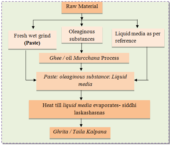 These lipid substances, mostly ghee [clarified butter] or taila [oil] acting as a solvent medium for fat soluble active and water-soluble active portion gets entrapped to form a single phase without separation. The amount of lipid substance [snehadravya] utilized is four times to that of the kalka [grind paste], if not specified.