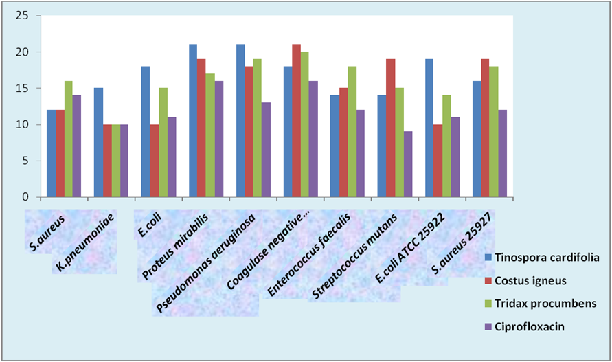 Results: The growth of K. pneumoniae, Proteus mirabilis, P. aeruginosa and E. coli were inhibited better with the plant extract Tinospora cardifolia leaves than ciprofloxacin antibiotic. Coagulase-negative Staphylococci was inhibited greatly with Costus igneus leaf extract. The growth of Enterococcus faecalic was inhibited significantly with Tridax procumbens leaf extract than ciprofloxacin.