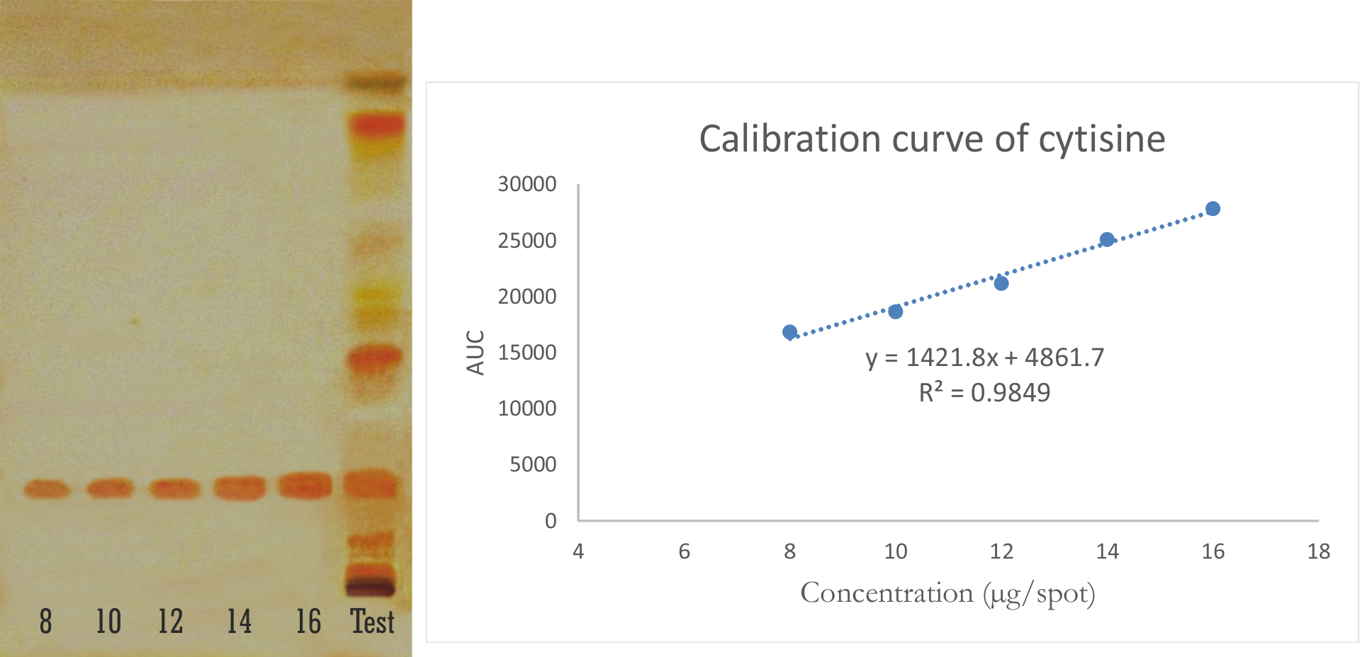 Three microliters of test solution (200 mg mL-1) of the extract was spotted along with 8-16 µl of standard solution on plates for estimation of cytisine. Peak areas were noted and quantification was performed using linear regression equations of respective compounds. A calibration curve was derived by plotting peak area versus concentration. The correlation coefficient, slope intercepts and regression equation were also calculated to estimate the mathematical estimate degree of linearity.