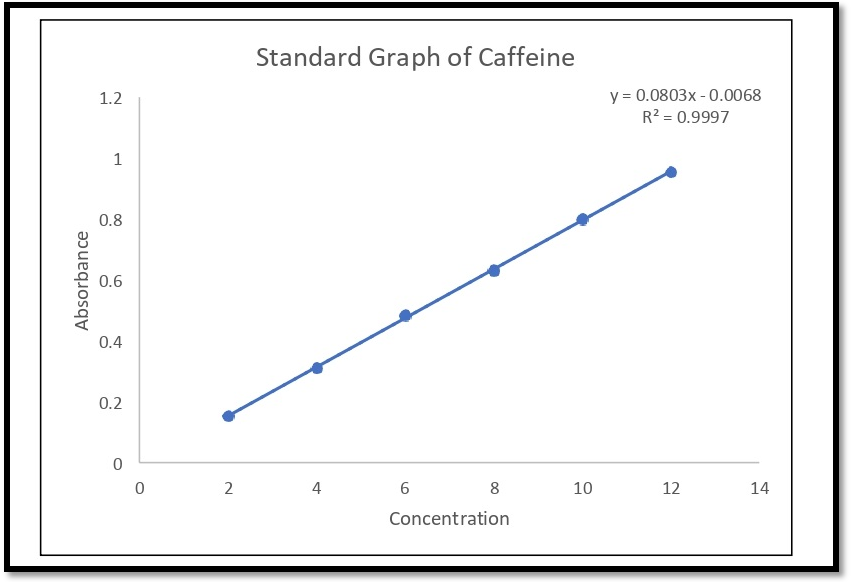 Table 1 depicts the absorbance of caffeine standard solution of concentrations 2, 4, 6, 8, 10 and 12 ppm measured at 274 nm and also the absorbance of different sample solutions at the same wavelength.