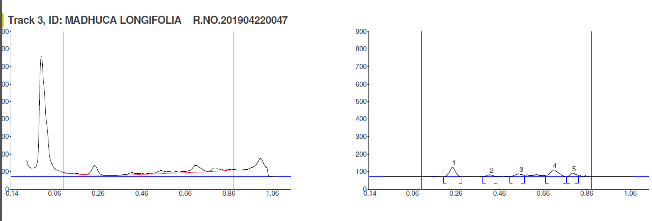 Madhuca longifolia leaves: Rf value = 0.50, Area= 533.9