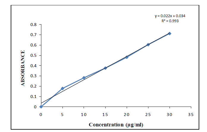 The method, according to Kim [14] was proceeded to estimate the total flavonoid content. 1 ml ethanolic leaf extract of 1000 μg/ml concentration was taken and 4 ml of distilled water was added, followed by the addition of 0.3 ml NaNO2 and 0.3 ml AlCl3 to the solution. The mixture was incubated at room temperature for 5 min. To the incubated solution, 2 ml of sodium hydroxide and 2.4 ml distilled water were added and the absorbance was measured at 510 nm using a spectrophotometer. Total Flavonoid content was estimated from standard curve. Rutin and Quercetin were used as standards and Total Flavonoid content was expressed as rutin/Quercetin equivalents (RE/QE) in mg/g of the dry sample.