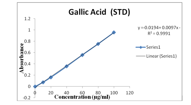 Folin-Ciocalteu (FC) reagent was used for the determination of total phenolic content spectrophotometrically according to [15] with slight modifications. 0.1 ml of leaf extract (1 mg/ml) was taken in a test tube, 1.9 ml distilled water and 1.0 ml of Folin–Ciocalteau’s reagent was taken in a test tube, and then added 1.0 ml of 100 g/l Na2CO3 to the solution. The mixture was stored under room temperature for 2 h and the absorbance of the solution was measured at 765 nm using a spectrophotometer. Total phenolic content was estimated from the standard curve of gallic acid. The total phenolic compounds of the plant extract were expressed as gallic acid equivalents (GAE) which denoted the phenolic content equal to the gallic acid (mg/g) of the dry material.