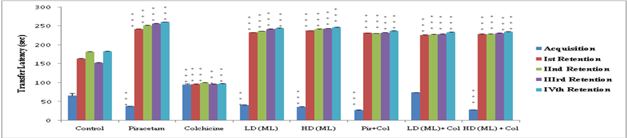 The efficacy of Madhuca longifolia leaf extract on the step-through passive avoidance paradigm is represented in fig. 6. The acquisition trial was performed and no substantial difference was identified. Outcomes are stated as AVERAGE±SEM (n=6), *P<0.05, **P<0.01, ***P<0.001 when one-way ANOVA method followed by Dunnett’s tests to compare with the control group. In the group that received leaf extract; a decrease in transfer latency was observed suggesting nootropic activity. The 200 mg/kg dosage of the Madhuca longifolia leaf extract showed a substantial decrease in the mice's transfer latency. This showed the efficient memory-enhancing activity of the flavonoid fraction of leaf extract of Madhuca longifolia.