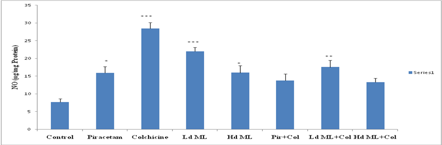 The impact of Madhuca longifolia leaf extract on the level of NO of mice's brain homogenate is represented in fig. 8. On the 29th d; the mice were sacrificed and the brain homogenate was prepared to measure changes in NO level. The statistics were represented as MEAN±SEM (n=6), *P<0.05, **P<0.01, ***P<0.001 when the one-way ANOVA test was followed by Dunnett’s tests and compared with the control group. In the leaf extract (flavonoid fraction); a substantial decrease in the amount of NO was found, thus confirming its memory-enhancing property.