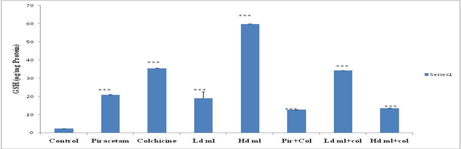 The response of Madhuca longifolia leaf extract on GSH level in brain homogenate of mice is represented in fig. 9. On the 29th d, the mice were sacrificed and brain homogenate was prepared to estimate the changes in GSH level. Statistics were represented in terms of MEAN±SEM (n=6), *P<0.05, **P<0.01, ***P<0.001 when the one-way ANOVA test was followed by Dunnett’s tests and compared with the control group. The leaf extract (flavonoid fraction) showed a large increase in GSH level, thus confirming its nootropic property.