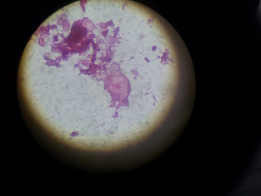 In the present study 234 pregnant women attended OP and OP GYN and OBG dept. Highest number of cases were reported in the age group 20-29 (81%) followed by 30-39 (13.7%),<20 (4.4%) and 40 and above (0.9%) (fig. 1). The majority of the patients were reported with 3rd trimester 145 (61.5%) of pregnancy followed by 2nd trimester 74 (32%) followed by 3rd trimester 15 (6.5%) (fig. 2). In Amsel’s criteria, if any three factors were positive indicates bacterial vaginosis. Out of 234 study subjects, Increased homogenous vaginal discharge was found in 132 patients (56.4%), whiff’s test positive was seen in 59 patients (25.2%), clue cells (fig. 3) were observed in 48 patients (20.5%) and pH greater than 4.5 was seen in 115 patient high vaginal swabs (49.1%) (table 1). Table 2 showed the results of BV cases based on Nugent’s scoring system ranging from 0-10. Maximum numbers of cases 109 were reported in the score 7-10 (80.7%) out of 135 cases. Score 4-6 was reported in 11 cases (8.1%). From the table 3 it was observed that, 87 cases (37.1%) were reported to have vaginitis out of 234 samples according to Amsel’s criteria and 95 cases with score>7 were reported to have vaginitis out of 234 samples according to Nugent’s criteria. Among 234 urine samples subjected to microbiological analysis, 82 urine samples showed microbial growth. The major isolate was E. coli 34(41.4%) followed by Proteus species 18 (21.9%), S. aureus 15(18.3%), Pseudomonas aeruginosa 10(12.2%) and Enterococci spp 5(6.2%). Out of 234 patients, the mixed infection bacterial vaginosis and asymptomatic urinary tract infection was found in 51 patients (21.7%).