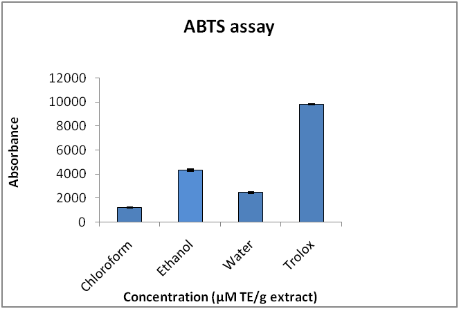 In the present study chloroform, ethanol and water were subjected to ABTS assay along with standard trolox and ethanol extract showed the highest activity among chloroform and aqueous extract.