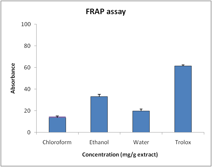 In this assay with leaf extract, the presence of antioxidants in the sample would results in the reduction of ferricyanide Fe3+ to ferrocyanideFe2+ by donating electron. Methanol extract were subjected to FRAP assay along with standard Trolox. In the result obtained, ethanol extract showed higher activity than chloroform and aqueous, which was comparable to standard Trolox (fig. 2).
