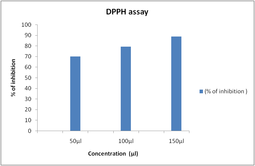 Where A0 was the Absorbance of the control reaction and A1 was the Absorbance in the presence of test or standard sample [18]. Theresults were analysed in triplicate [19]. The IC50 value is the concentration of sample required to inhibit 50% of the DPPH free radical.
