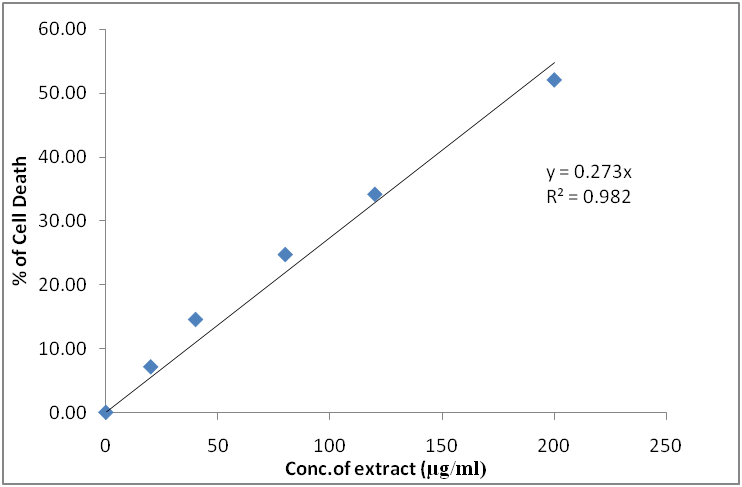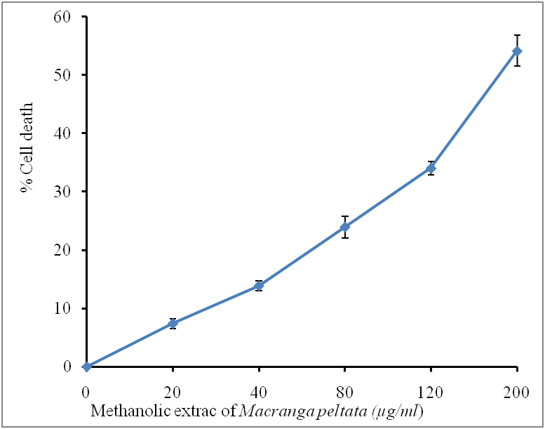 Fig. 4: A) Cytotoxicity and % of cell death on M. peltata leaf extract