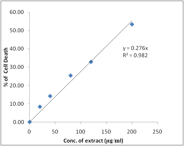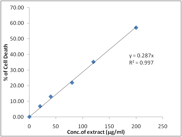 The result was expressed as mean standard deviation. Descriptive statistics was used to analyse the mean, standard deviation, variation and level of statistical significance between groups. When p<0.05 and p<0.01, it was considered statistically significant for analysis for analysis of percent inhibition of cell growth.