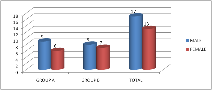 The table provides the number of males and females within each group. In Group A, there are 9 males and 6 females, while in group B, there are 8 males and 7 females. The total number of participants in the study group is 17 males and 13 females.