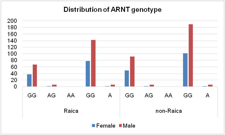 Fig. 3: Distribution of ARNT genotype and allele type in males and females of Raica and non-Raica communities, the difference in GLUT4 genotype and allelic distribution in males and females of Raica and non-Raica communities were similar to ARNT genotype distribution [fig. 4]