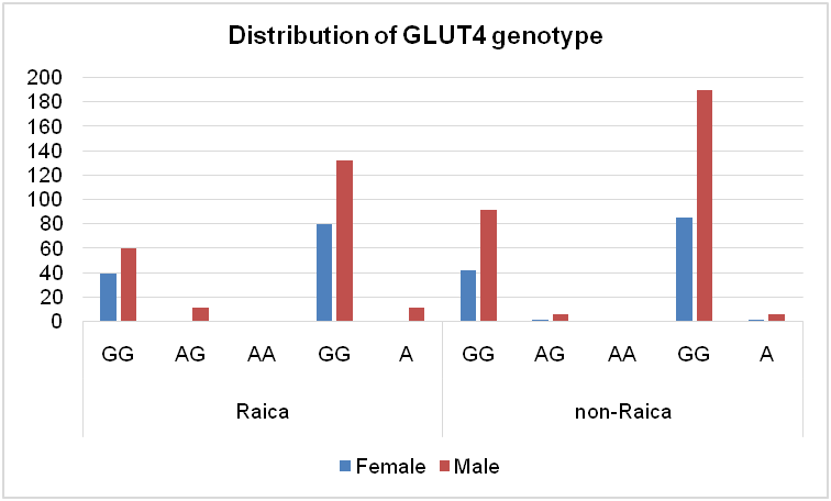 Fig. 4: Distribution of GLUT4 genotype and allele type in males and females of Raica and non-Raica communities