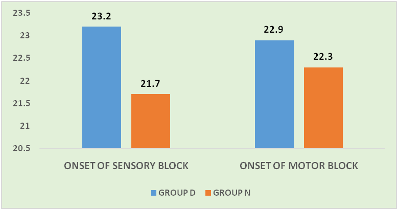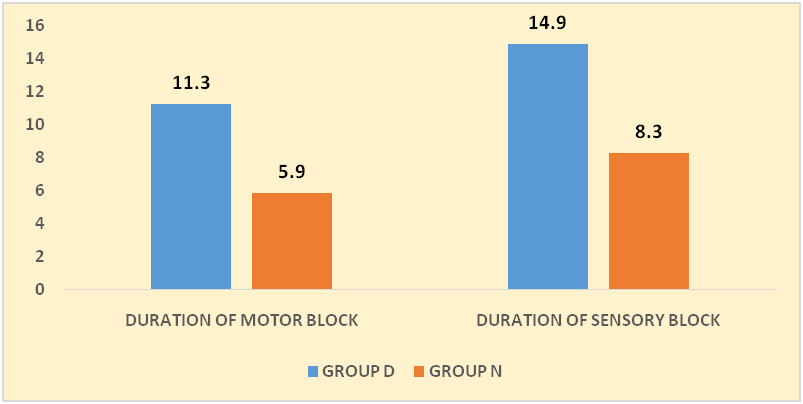 Results: The mean onset of sensory block in group D was 23.2±6.8 min, while 21.7±6.9 min in group N (p 0.3999). This was not statistically significant. The onset of motor block was 22.9±7.9 in group D and 22.3±7.1 in group N, which were statistically insignificant (p 0.7581). The duration of the motor block in group D was 11.3±3.2 h, whereas it was 5.9±2.3 h in group N (p 0.0001), which was statistically significant. The length of the sensory block in group D was 14.9±3.8 h, while it was 8.3±3.4 h in group N (p 0.0001), which was also statistically significant. The VAS score in group N was significantly higher than in group D; it began 3 h after surgery and remained at 4 h, 5 h, 6 h, 8 h, 10 h, and 12 h. All 30 patients in Group N required their first rescue analgesia during the first 12 h postoperatively. In contrast, only 12 patients (40%) required their first analgesia within the first 12 h, and 18 (60%) requested their first analgesia within the second 12 h.