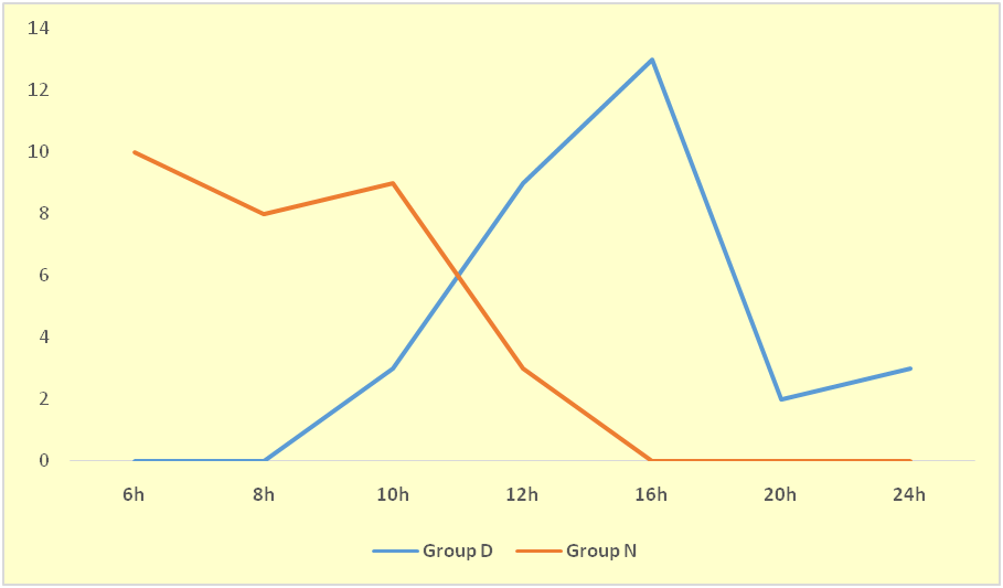 Regarding age, gender, and body weight, there was no statistically significant difference between the two research groups (p>0.05). The onset of sensory block in group D was 23.2±6.8 min, while it was 21.7±6.9 min in group N (p=0.3999). This was not statistically significant. The start of the motor block was 22.9±7.9 in group D and 22.3±7.1 in group N, both of which were statistically insignificant (p 0.7581) (table 2, fig. 2 and fig. 3). The length of the motor block in group D was 11.3±3.2 h, whereas it was 5.9±2.3 h in group N (p=0.0001), which was statistically significant. The length of the sensory block in group D was 14.9±3.8 h, while it was 8.3±3.4 h in group N (p=0.0001), which was also statistically significant. Table 3 and fig. 4 shows the VAS score between the two groups. In group N VAS score was 0.12±0.26 on 3rd postoperative hour and gradually increased to 0.38±0.67, 2.64±1.67, 2.62±1.59, 2.89±1.82, 3.9±1.80, 2.5±1.32, 3.6±1.9, 3.79±1.82. on 4th, 5th, 6th, 8th, 10th, 12th, 16th, 20th, 24th h postoperative period respectively. The VAS was considerably greater in group N compared to group D at 3 h, 4 h, 5 h, 6 h, 8 h, 10 h, and 12 h following surgery. Table 4 and fig. 5 illustrates the duration of analgesia as measured by the visual analog scale (VAS). All 30 patients in Group N required their first rescue analgesia during the first 12 h postoperatively. In contrast, only 12 patients (40%) required their first analgesia within the first 12 h, and 18 (60%) requested their first analgesia within the second 12 h.