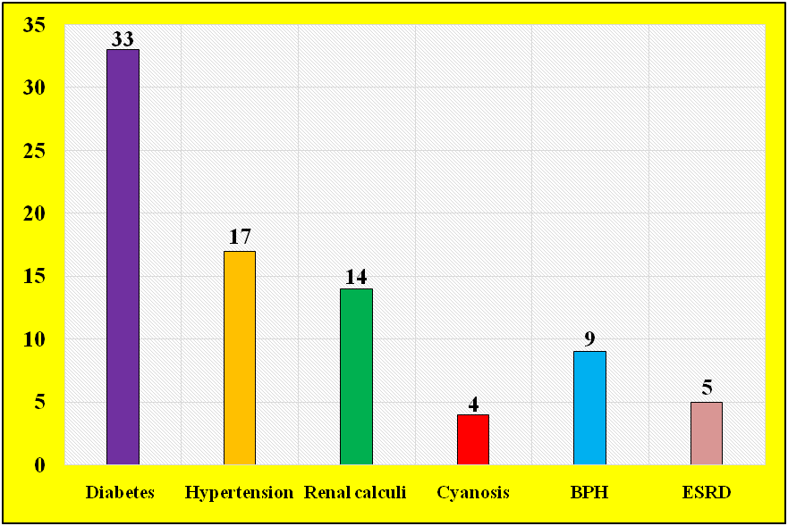 Results: In a total of 35 patients suffering from UTI, we found that 7 were males and 28 were females, based on age groups; 2 patients belong to 21-30 y and 18 patients belong to 31-40 y, 10 patients belong to 41-50 age group, 3 patients belong to 51-60 y. In a total of 82 risk factors 40% were diabetes mellitus, 20% were hypertension, 17% were renal calculi, 5% were cyanosis, 11% were BPH, 6% were ESRD. In a total of 95 clinical symptoms, we observed fever (32.5%) as a major symptom, followed by burning micturition (16.5%). Other signs like abdominal pain, urine urgency, hematuria were also reported. On assessing urine culture, uropathogens Escherichia coli (35%) was isolated in majority UTI cases followed by Staphylococcus aureus (17%), Pseudomonas aeruginosa (14%), Candida species (14%), Enterococcus faecium (11%), Proteus species (8%). Total drugs prescribed were 150. Fluoroquinolones (48 in number, 32%) were the most common prescribed antibiotic drug category, followed by Anti-mycobacterial (32 in number, 21%), Cephalosporins (25 in number, 17%), Penicillins (20 in number, 13%), Macrolides (14 in number, 10%), Combinational therapy (11 in number, 7%).