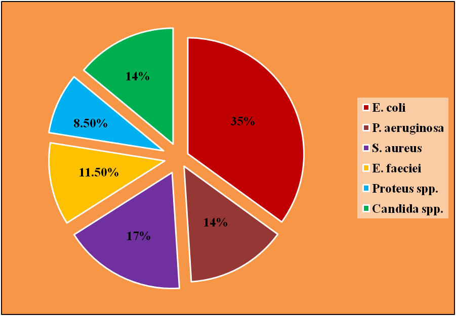 In both community and hospital settings, urinary tract infections are most prevalent and frequent bacterial illnesses in people, affecting all sexes and all age groups (Hooton et al., 1995). Burning urination, lower abdominal pain, a fever, or chills are some of the warning signs and symptoms (Nkudic et al., 2005). The goal of this study was to learn more about the microorganisms that cause UTI so that clinicians could select the best course of action. Following extensive research on-site, it was discovered that 80% of study subjects were female and 20% were male. We discovered that females are more likely than males to experience urinary tract infections. Our findings were compared to those of Mohamed Hayir et al., who published a study in 2019 on "Bacterial uropathogens in UTI and antibiotic susceptibility patterns in Banadir hospital, Mogadishu-Somalia" and found that both groups had similar findings. The percentage of males and females was 86.4% and 13.6%, respectively. In our analysis, the age range affected most frequently 31 to 40 y had 18 instances (51%). Dinesh K. Dhodi et al.'s study from 2014 on the "Prescribing patterns of antibiotics among patients of UTI with pre-existing renal disorders" produced results that were closely comparable, showing that 55 patients (44%) belonged to the 31-45 y age range. Patients with hypertension (17 in number, 20%) and diabetic patients (33 in number, 40%) were the two groups most frequently impacted by UTI. This was in contrast to a 2012 study by Arul Prakasam et al. entitled "A cross-sectional study on distribution of urinary tract infection and their antibiotic utilization pattern in Kerala" which revealed that diabetes and smoking were the two most common risk factors. 35 patients in total had 95 clinical symptoms found. We discovered that the majority of patients, or 32.5%, had a fever at the time of admission. It was compared to a study done in 2016 on "Clinical Study of UTI in Malla Reddy Institute of Medical Sciences, Hyderabad" by Rajashekar Rao et al., and both studies found that fever was the most prevalent symptom in UTI patients. Escherichia coli was the most frequently identified causal agent in the current investigation, accounting for 35% of UTI cases. In a study by Shintu Shaji et al., published in 2021, "A study on antibiotic sensitivity pattern for hospitalized UTI in south India" also accounted for the same, or 50% (the most common isolated species was E. coli).
