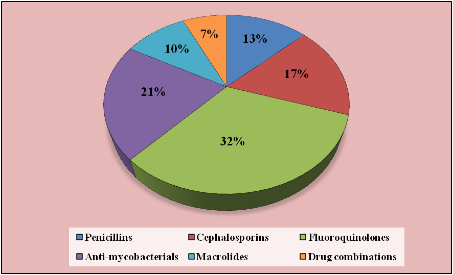 Amoxicillin+Clavulanic acid was the medication that was prescribed the most frequently among a total of 20 Penicillins. The most often recommended medication in a total of 25 Cephalosporins was Cefixime. Nitrofurantoin was the most often recommended medicine out of a total of 32 anti-mycobacterial drugs. The most often given medication across all 14 Macrolides was azithromycin. All these results were contrast to study conducted by "Alavudeen et al., in 2021 "Evaluation of antibiotic prescribing practices and antimicrobial sensitivity patterns in urinary tract related infectious diseases" in which Amikacin was highly prescribed drug in Penicillins category, Cefuroxime was highly prescribed drug in Cephalosporins category, Meropenem was highly prescribed drug in Anti-mycobacterial, Clindamycin was highly prescribed in Macrolides. As our research was ongoing, it was discovered that doctors were restricted to using hospital formularies to treat UTI. In a total of 150 prescribed antibiotics, fluoroquinolones (48, 32%), anti-mycobacterial agents (32, 21%), cephalosporins (25, 16%), penicillins (20, 13%), and macrolides (14, 9%) were the most frequently prescribed medication groups. In support of this, Arul Prakasam et al.'s 2012 study, "A cross-sectional study on distribution of urinary tract infection and their antibiotic utilization pattern in Kerala" found that fluoroquinolones were the most often prescribed antibiotics for UTIs.