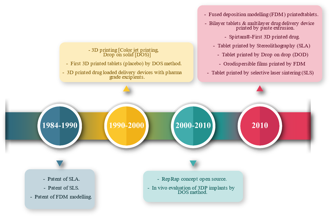 In mid 1980s, stereolithography apparatus was first invented and patented by Charles Hull. In this process UV light polymerizes the resins to obtain the desired object. In 1988, the first commercial SLA printer was produced by 3D systems [8]. In 1989 S. Scott and Lisa Crump patented fused deposition modelling (FDM), wherein a metal wire or plastic filament were heated in the nozzle and then extruded [9]. Later Carl Deckard, an undergraduate student at Texas University invented Selective Laser Sintering (SLS) technique. The first SLS printer was produced in the year 1992 [10]. Spritam® (levetiracetam) the first commercial 3D tablet was approved by the USFDA in August 2015 [11].
