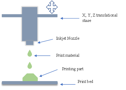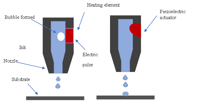 Drop on demand inject printing method is quite simple provides excellent precision in affordable cost. In continuous inkjet printer's droplets are expelled by external pressure, whereas in drop-on-demand inkjet printers droplets acquire their kinetic energy from nearby sources situated within the printhead [31]. Drop-on-demand inkjet printer further classified in thermal inkjet and piezoelectric printer based on printhead type [32].
