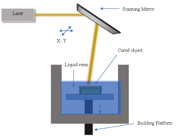Stereolithography is based on the solidifying of liquid resins through photopolymerization by utilising ultraviolet light. First, a large vat is filled with resin and subjected to a radiation source from the top or the bottom in a desired geometric pattern. Stereolithographic techniques can attain reasonably high resolution by employing regular radiation sources to reach the diffraction limit of light. Continuous liquid interface processing (CLIP) and digital light processing (DLP) are other techniques related to stereolithography [34, 35].