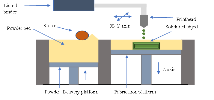 It is also known as the drop-on-powder method which is an application of inkjet printing technology. A printer nozzle containing the binder fluid is designed to move along an x-y axis and jet the liquid onto the loose powder bed. Printhead of jet printer could be thermal or piezoelectric. The liquid drips moisten the powder, which causing the layer to harden and solidify [18]. Subsequently, the manufacturing platform moves downward along the z-axis while the powder supply platform rises. A roller is then used to transport a powder layer from the bed to the top of the previously bound layer. This method is performed several times until the 3D product is completed [18, 33].