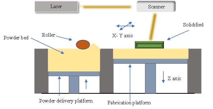 A specific rapid prototyping, additive manufacturing (AM) or 3D printing process called selective laser melting (SLM) aims to melt and fuse metallic powders using a high power-density laser. SLM uses a powerful laser beam to create 3D parts, such as SLA, which uses a UV laser. The laser beam melts and combines different metallic particles together while printing [39]. A building platform is covered with metal powder which has been heated nearly to its melting point and spread using a roller. The cross-section of the 3D object is drawn into the powder material using a laser after which the chosen particles are fully combined to obtain 100% density. In this manner, the melting happens when the grain viscosity decreases with an interfacial connection between the grains but not when the temperature melts completely. Grain viscosity in 3D printing refers to the flow behavior and thickness of the material being used for printing, often associated with granular or particulate materials like powders. 2D cross-section made up of layers with thicknesses of 20 to 100 microns. An even layer of metallic powder is then applied using a recoater to construct the part and each layer is fused separately in a precisely regulated inert environment. Once the printing process is finished any leftover powder is cleared away. During the procedure laser is utilized to shape the powder layers and the object is created using with laser energy [40].