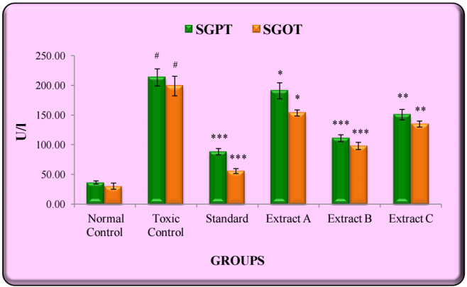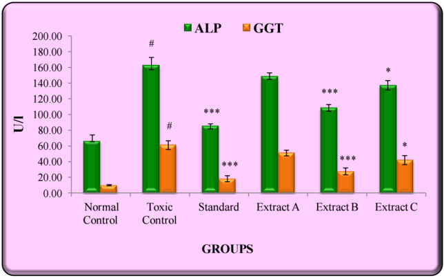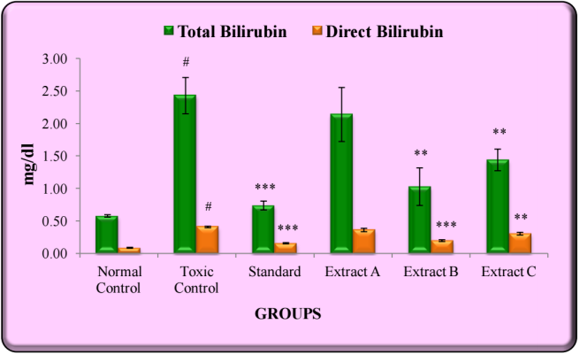 Administration of CCl4 (1 ml/kg, 1:1 solution in olive oil, i. p.) for three alternate days resulted into significant hepatotoxicity in rats, indicated by the elevated serum levels of SGPT, SGOT, ALP, GGT, total bilirubin, direct bilirubin and total cholesterol. Pretreatment of rats with the test extracts (at the dose of 300 mg/kg) exhibited a marked decrease in the elevated levels of all the markers, wherein Extract-B showed the most significant protection.