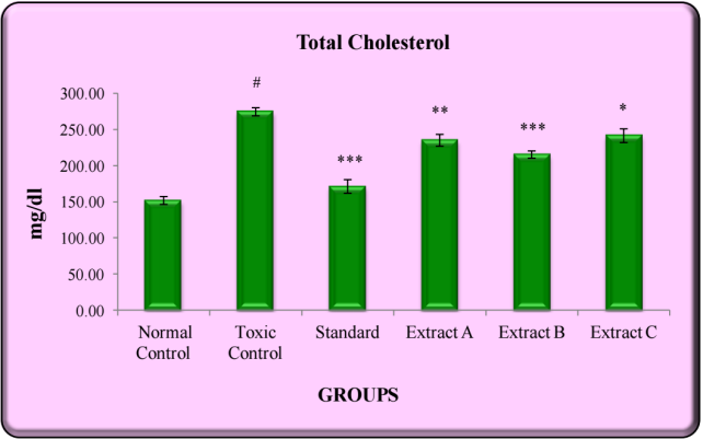 Each bar represents mean±SEM of six observations. Comparisons are made between Group I vs II and Group II vs III, IV, V and VI; #significantly different from Normal control group, p<0.001, *significantly different from Toxic control group, p<0.05, ***significantly different from Toxic control group, p<0.001.