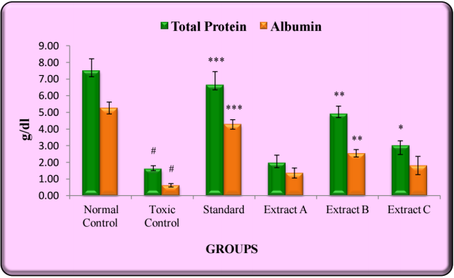 Administration of CCl4 showed a significant lowering in total protein and albumin levels in rats. Extract-B elevated the decreased serum levels of protein and albumin both significantly (p<0.01), though the effect was lesser than the standard silymarin (fig. 1).