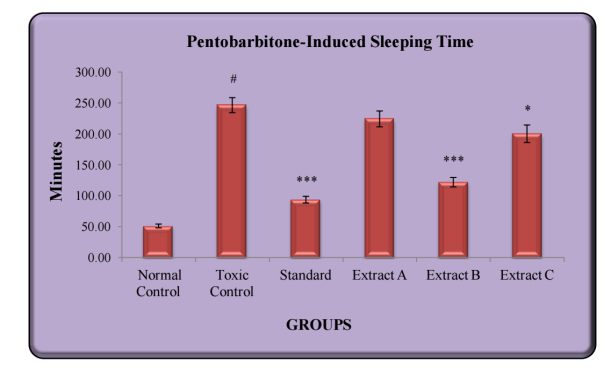 Fig. 2: Effect of test extracts on pentobarbitone-induced sleeping time in CCl4-induced hepatotoxicity in rats