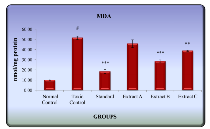 In order to evaluate the effect of pretreatment with different extracts on CCl4-induced lipid peroxidation, the levels of malondialdehyde were monitored. MDA serves as an indicator of oxidative damage and is considered as one of the principal products of lipid peroxidation. Results showed that MDA production in the liver in the toxic control group increased severalfold, as compared to the normal group. Consistent with the results of various enzymes at serum levels, pretreatment with silymarin and Extract-B significantly (p<0.001) decreased hepatic lipid peroxidation.