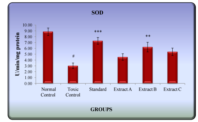 Each bar represents mean±SEM of six observations. Comparisons are made between Group I vs II and Group II vs III, IV, V and VI; #significantly different from Normal control group, p<0.001, *significantly different from Toxic control group, p<0.05, **significantly different from Toxic control group, p<0.01, ***significantly different from Toxic control group, p<0.001.