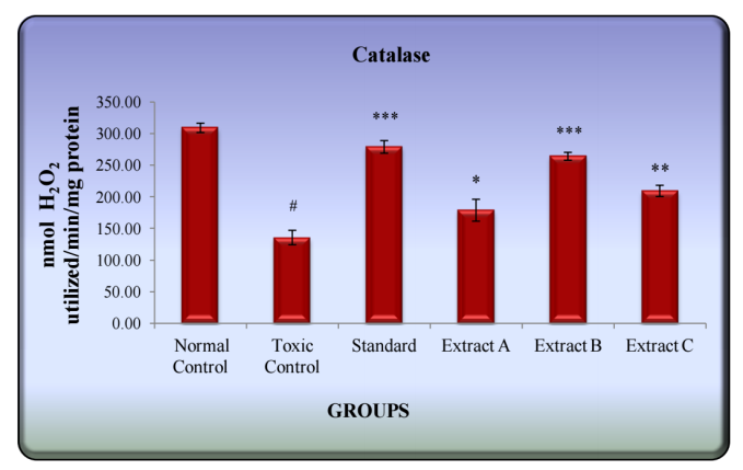 CCl4 significantly decreased the antioxidant defence mechanism as evident from the reduced activity of superoxide dismutase and catalase levels in liver homogenates. Treatment with Extract-B increased the levels of SOD and catalase significantly (p<0.01 and p<0.001, respectively). The effect of Extract-B on catalase activity was comparable to silymarin.