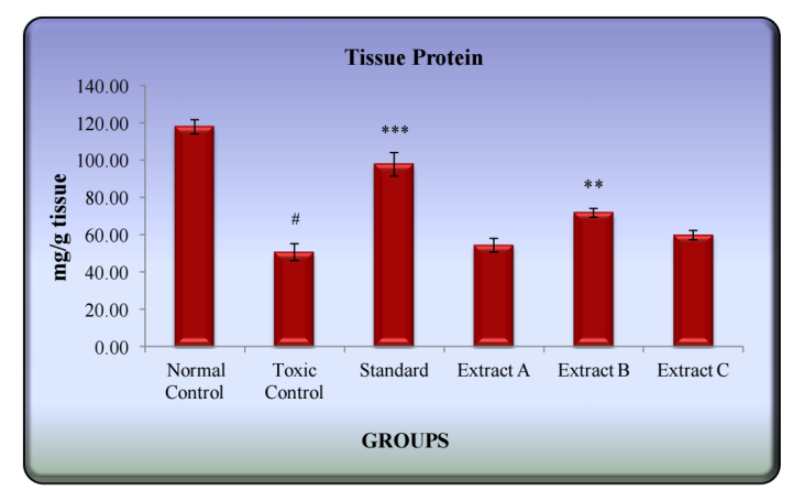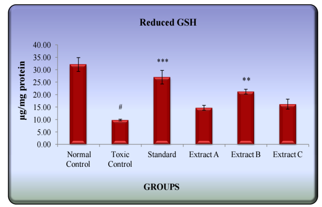 CCl4 administration caused a significant (p<0.001) reduction in GSH concentration and tissue protein in liver, as compared to normal animals. In animals pretreated with Extract-B, the liver GSH and protein contents were significantly found higher than that of the toxicant group (fig. 3).