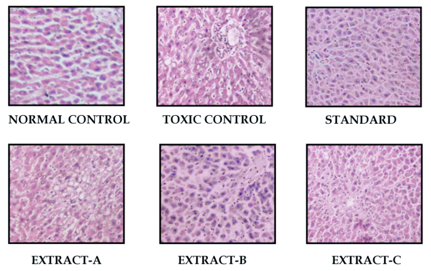 Test Extract-B treated rat liver tissue showed histopathology nearly similar to standard silymarin-treated group, where areas of regeneration were clearly seen with mild inflammation and lymphocyte infiltration in the necrotic area. While slight recovery from the liver damage was observed in the Extract-C treated animals, Extract-A did not show significant improvement in the damaged liver tissues. So, as per the histopathological study also, Extract-B proved to have a significant hepatoprotective effect.