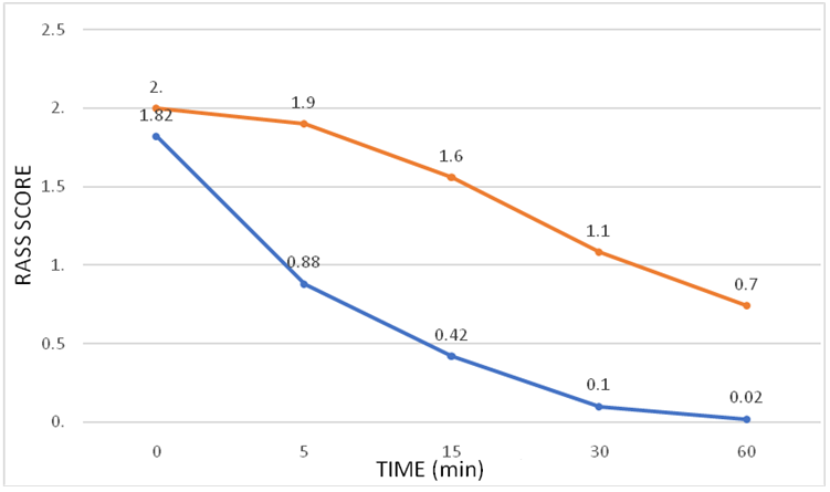 Postoperative RASS scores were lower in Group M (Magnesium) compared to Group N. The post-operative RASS scores between the two groups were statistically highly significant during 1 hour of PACU stay as p values are<0.05, except at 0 min after admission in the PACU (fig. 2).