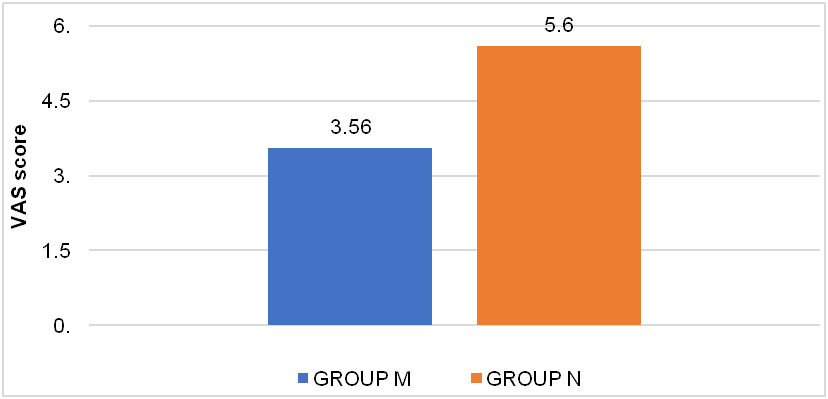 Fig. 3: Comparison of vas scores between the two groups, VAS scores were significantly lower in the Group M compared to Group N, (p<0.0001) (fig. 3)