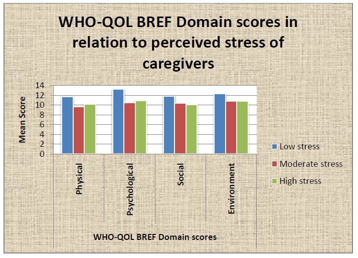 Most of the caretakers had moderate perceived stress (76%), while 12% had high perceived stress and only 12% had low perceived stress. All the WHO QOL domain scores were highest among patients with low perceived stress. Significant association was found between physical (p=0.006) and psychological scores (p<0.001) and perceived stress of caretakers.