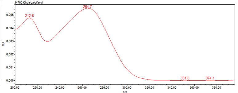 Suitable wavelength for the HPLC analysis for Cholecalciferol was determined by recording UV spectrum in the range of 200-400 nm. Suitable wavelength selected was 265 nm, considering the maximum absorbance at this wavelength (fig. 2).