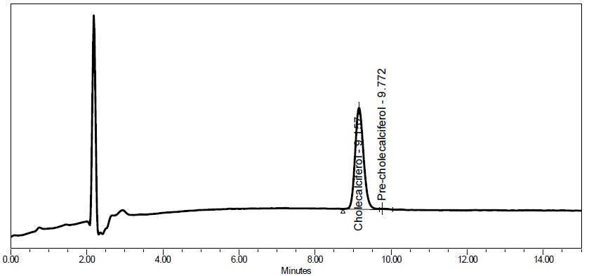 | Blank interference | No peak shall be detected in the blank at the retention time of Pre-Cholecalciferol and Cholecalciferol peaks. | Nil |