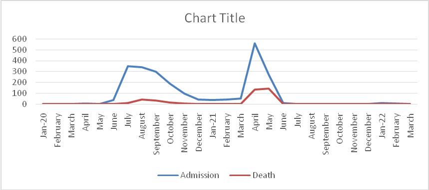 The number of COVID-19 cases started to rise and admitted to our level-2 COVID hospital in Feb 2020 and highest number of cases was recorded in the month of July, the cases begin to decline from the month of September 2020. The lowest number of cases was recorded in February 2021, then the case again begins to rise from Feb 2021 and peaked in the month of Apr; again, cases begin to decline and became almost zero by mid-Jun 2021. During all three waves of COVID-19 pandemic, the deaths were recorded from May 2020 and the highest number of death occurred during the months of Aug and Sep; after that the death rate begins to decline. No deaths were recorded during the months of Jan, Feb and Mar 2021. The cases of death were again reported from Apr 2021 and there was acute rise in the number of deaths from Apr to May 2021 and two deaths were recorded after the month of Jun, and again, admission of COVID-19 cases (n=16) started in Jan 2022 till Feb 2022 and two deaths out of 16 admissions were recorded [fig. 1].