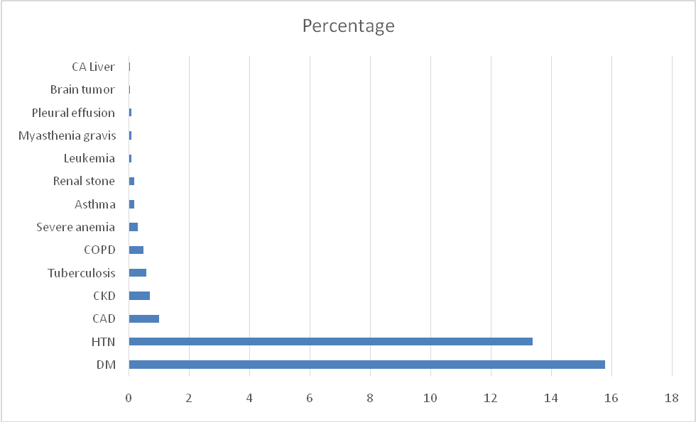 In present study, diabetes mellitus, 370(15.8%) was the most common comorbidity, followed by hypertension 314(13.4%). Comorbidities that were very uncommon were leukemia, myasthenia gravis, pleural effusion 2(0.1%) each and brain tumor and carcinoma liver 1(0.4%) each fig. 3.