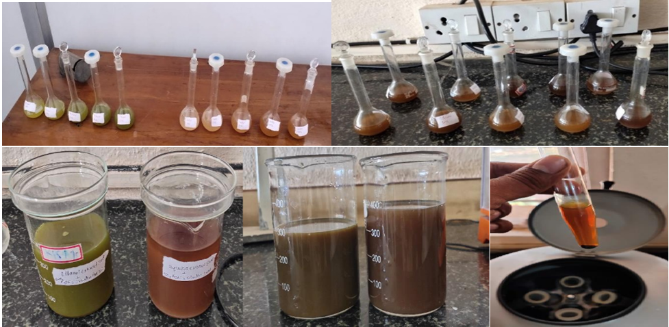 The freshly collected leaves were washed thoroughly in running water to take away the dirt and dust on the surface of the leaves. Then, they were kept drying under shade for 15-20 d. Later the dried plant leaves were crushed and made into a coarse powder. Then the extraction was carried out through the maceration process, where the aqueous and hydro-alcoholic extracts were taken by adding 25 g of leaves powder into each 250 ml of sterile water and 70% alcohol in two separate conical flasks and kept for 3-4 d with occasional stirring. After 3-4 d the plant extract was filtered and the plant liquid filtrate was collected as shown in fig. 2 and stored at-20 degrees Celsius in a tightly closed vessel for future use.