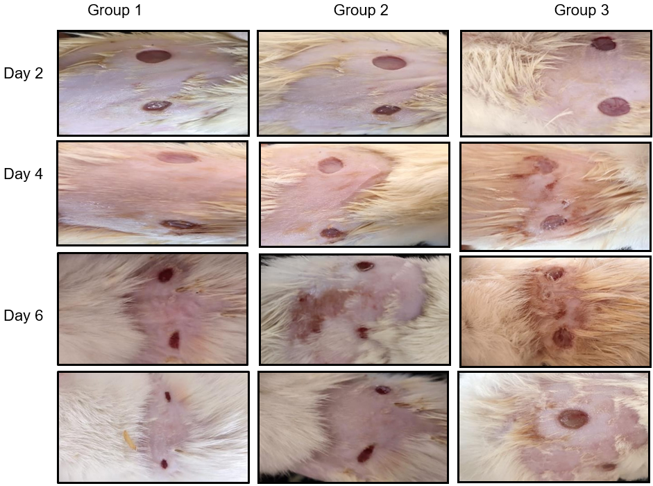 The 12 rats were divided into 3 groups (standard, sample, gel base) each containing 4 rats. All rats were anaesthetised using ketamine hydrochloride (50 mg/kg i. p body weight) before creating a wound. Then the animal fur in the dorsum was shaved with a sterilised electric razor and after disinfection of the skin with Dettol liquid full-thickness, round wounds of 6 mm in diameter were excised under aseptic conditions with the help of a sterile dermal biopsy punch followed by marking the initial wound area by placing transparent polythene sheet then the area is measured by using millimetre based graph paper. Later the rat's wounds were bandaged to avoid infection.