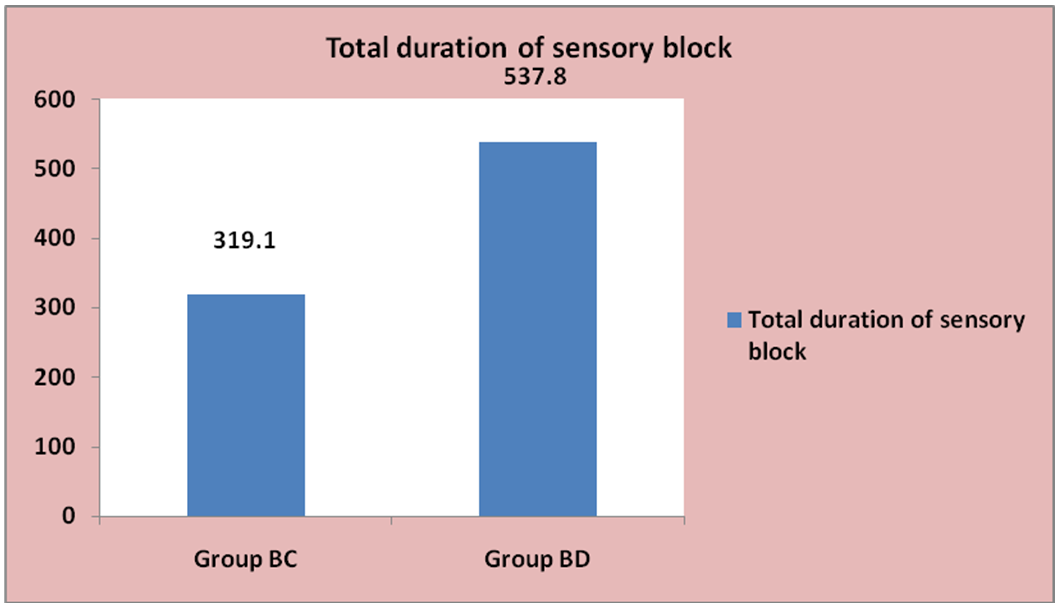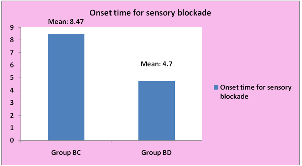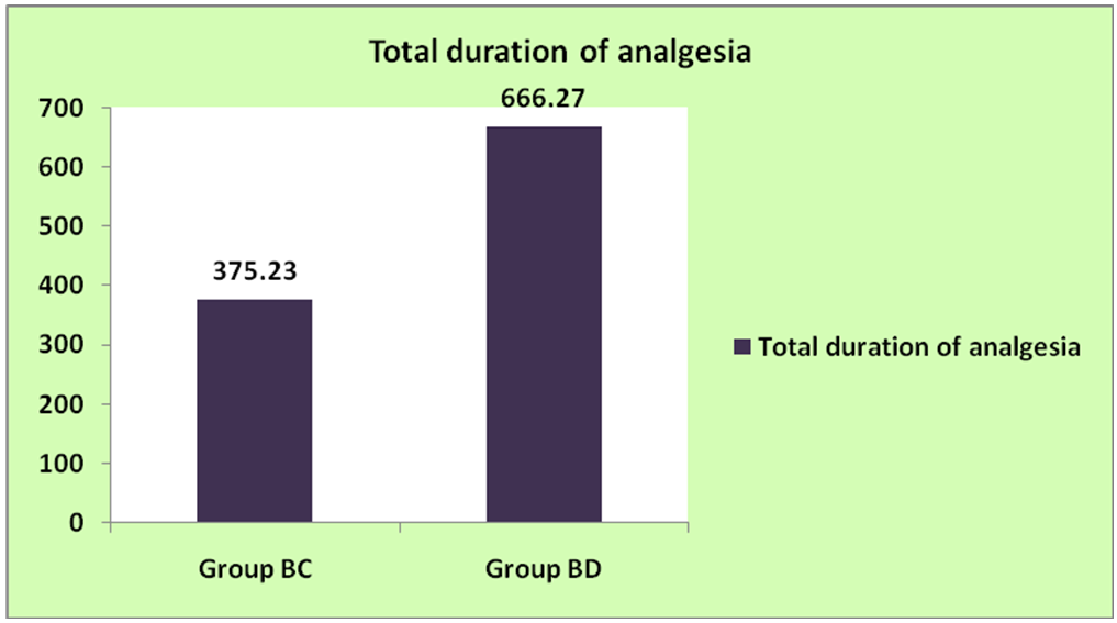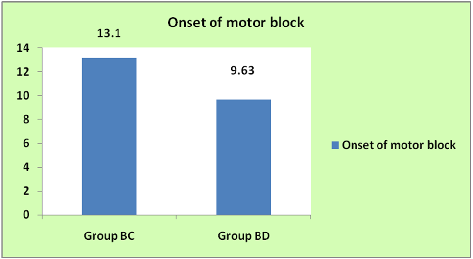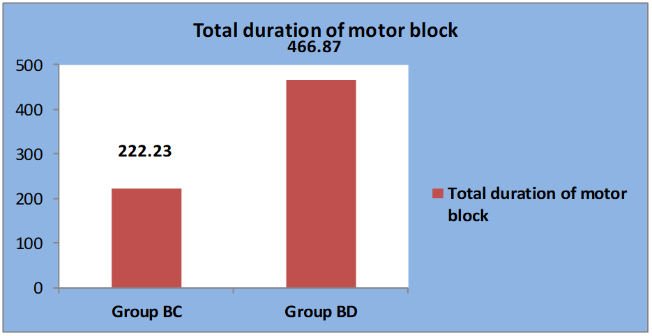 The mean time for onset of sensory block in Group BD was 4.7 min which was lower than Group BC-8.47 min. This was statistically significant (p<0.05) (table 1 and fig. 1). The mean time for onset of motor block in Group BD was 9.63 min which was lower than Group BC-13.1 min. This was statistically significant (p<0.05) (table 2 and fig. 2). The mean total duration of sensory block in Group BD was 537.8 min. This was higher than the Group BC-319.1 min and was statistically significant (p<0.05) (table 3 and fig. 3). The mean total duration of motor block in Group BD was 466.87 min. This was higher than in Group BC 222.23 min and was statistically significant (p<0.05) (table 4 and fig. 4). The total duration of Analgesia in Group BD was 666.27 min. This was higher than in Group BC–375.23 min and was statistically significant. (p<0.05) (table 5 and fig. 5). Bupivacaine dexmedetomidine group has better quality than bupivacaine clonidine group (table 6).